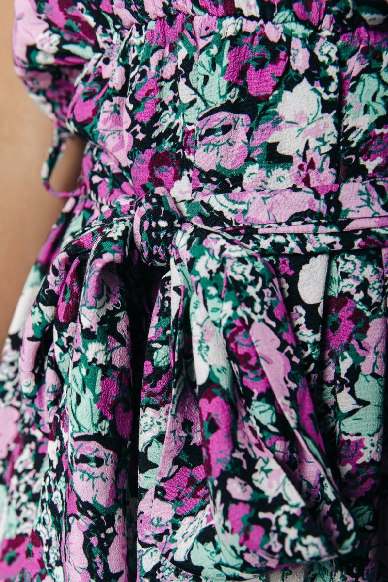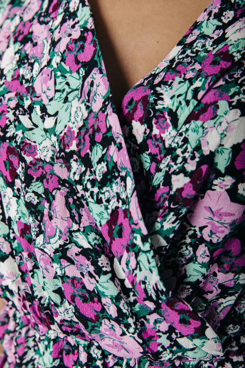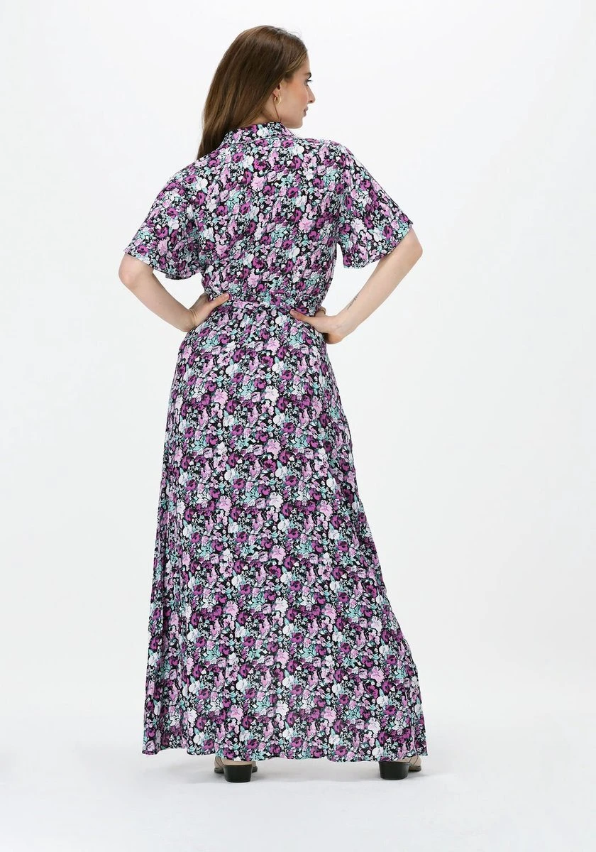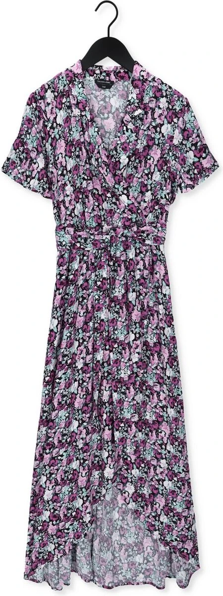 Wijduitlopende fitLange lengteKorte mouwWrap sluitingGouden metalen CR brandingBloemen dessin100% ViscoseNon stretch stofHandwas koud, niet in de droger, plat laten drogen, op lage temperatuur strijken of stomenModel is 1.70m en draagt S
