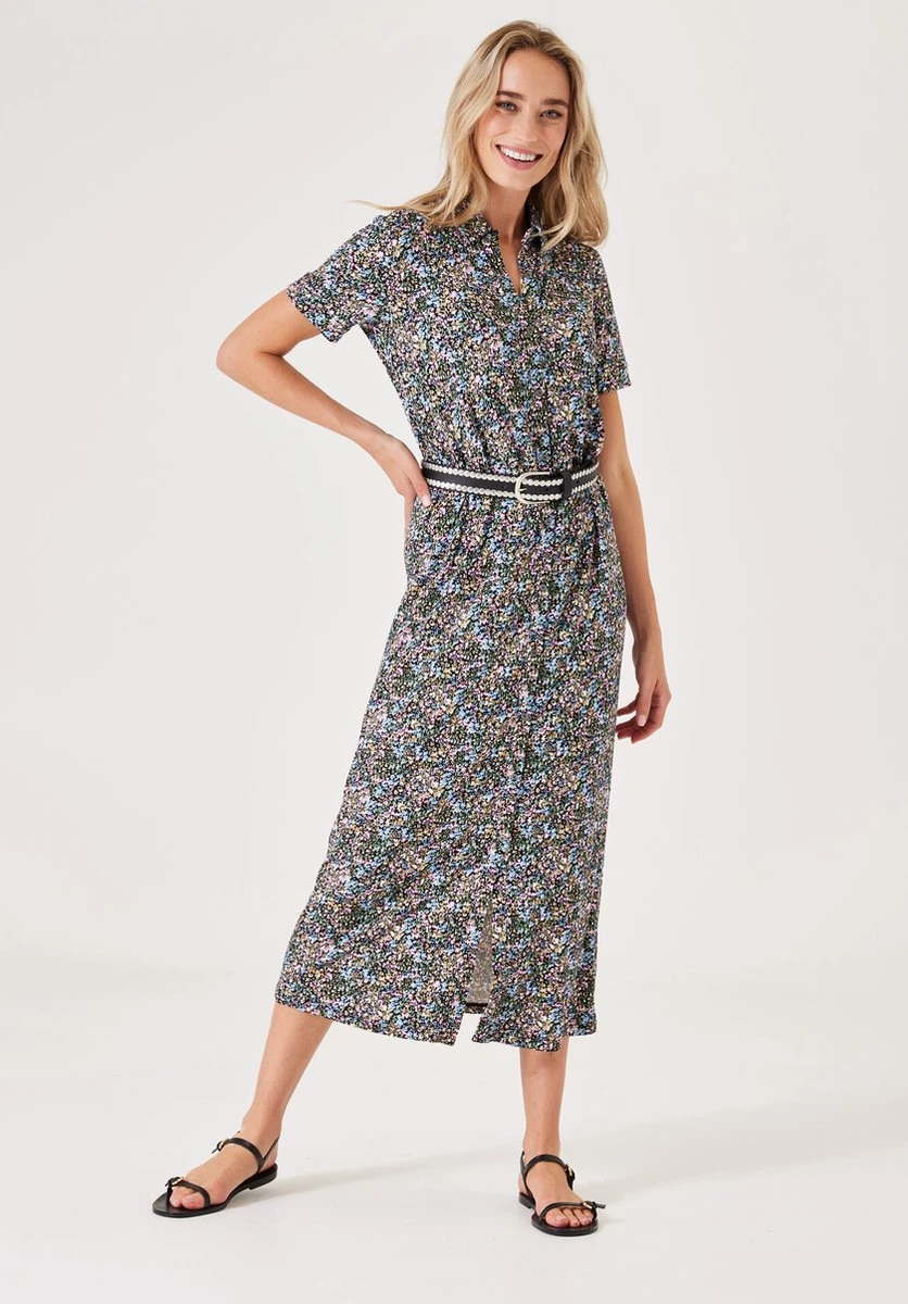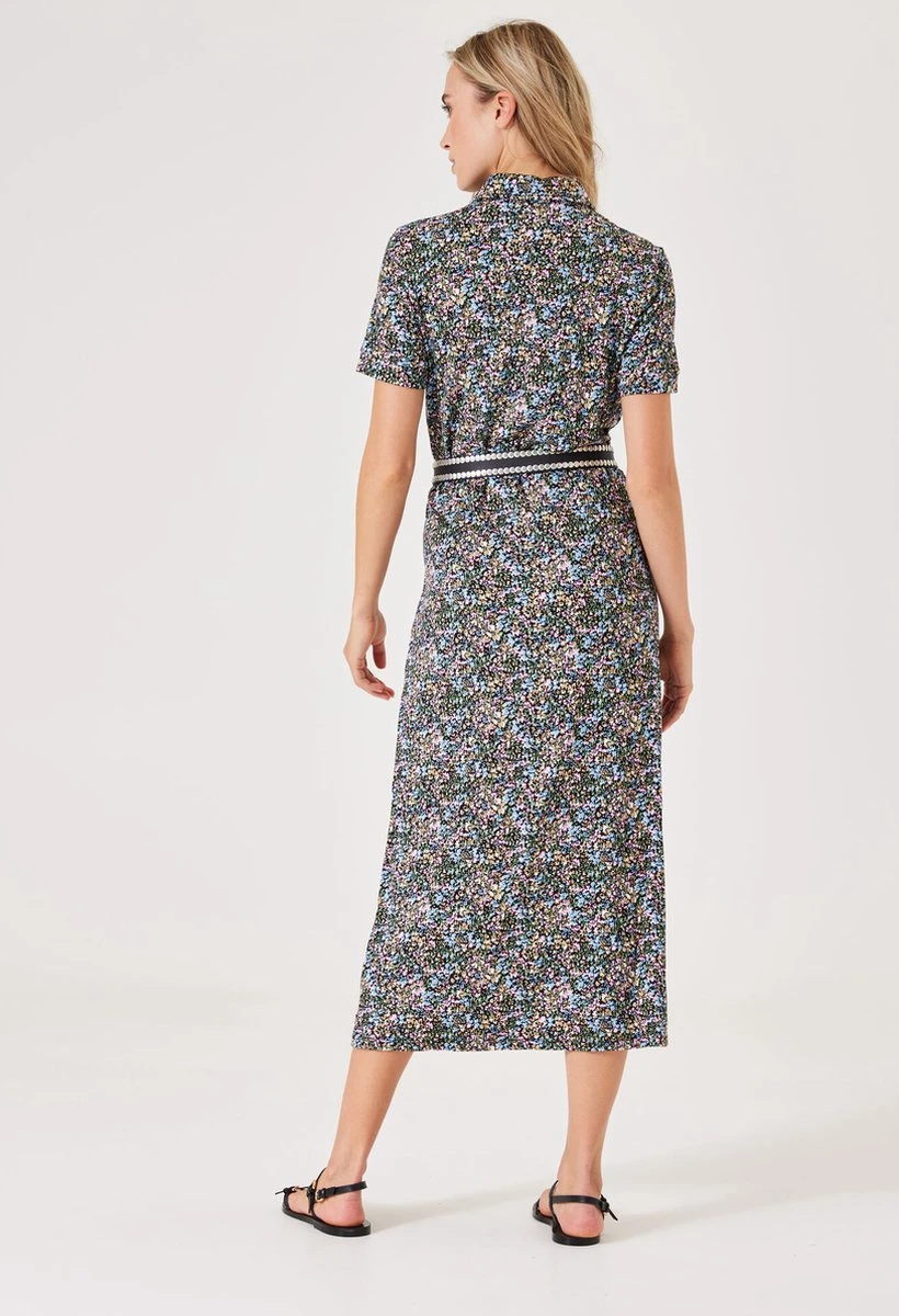 Maxi-jurk met allover bloemenprint. Met deze vrolijke print ben je helemaal klaar voor het voorjaar! De jurk heeft een knoopsluiting, een tailleceintuur en een relaxed fit. Dit item is gemaakt van 95% viscose en 5% elastaan.