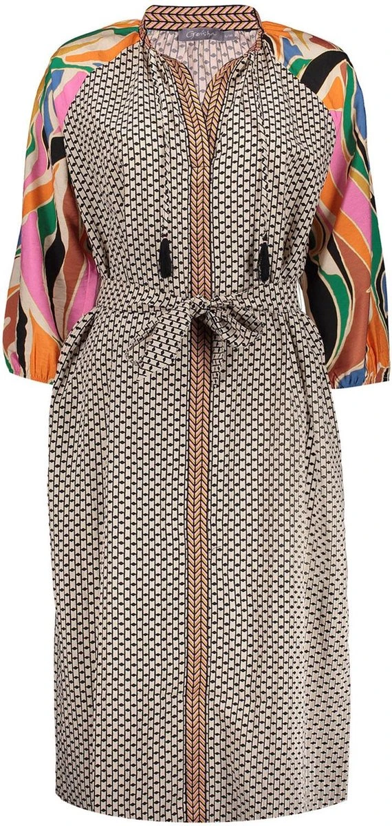 Jurk van Geisha met driekwart mouwen en een v hals voorzien van een strikkoord. Deze jurk heeft fel gekleurde mouwen met een elastische boord. Daarnaast wordt de jurk geleverd met een bijpassend strikceintuur. De totale lengte is 110 cm bij maat S/36. Lauw strijken max 110°c, Machinewas 30°c anti-kreuk, Niet bleken, Niet in de droger, Stomerij