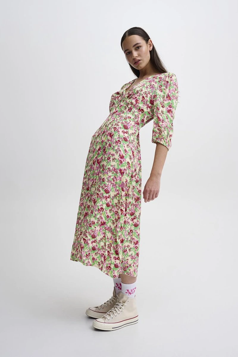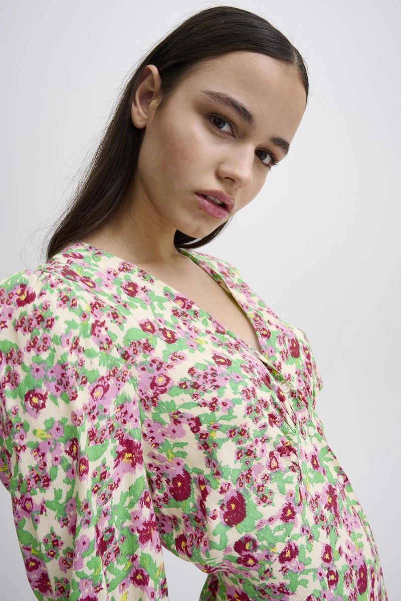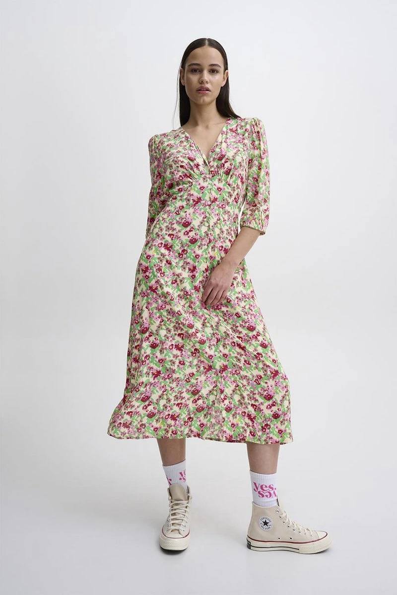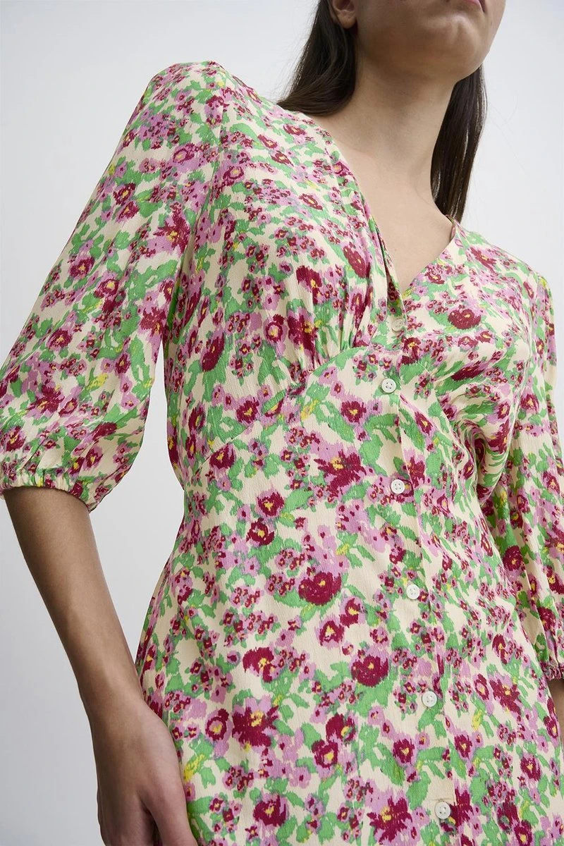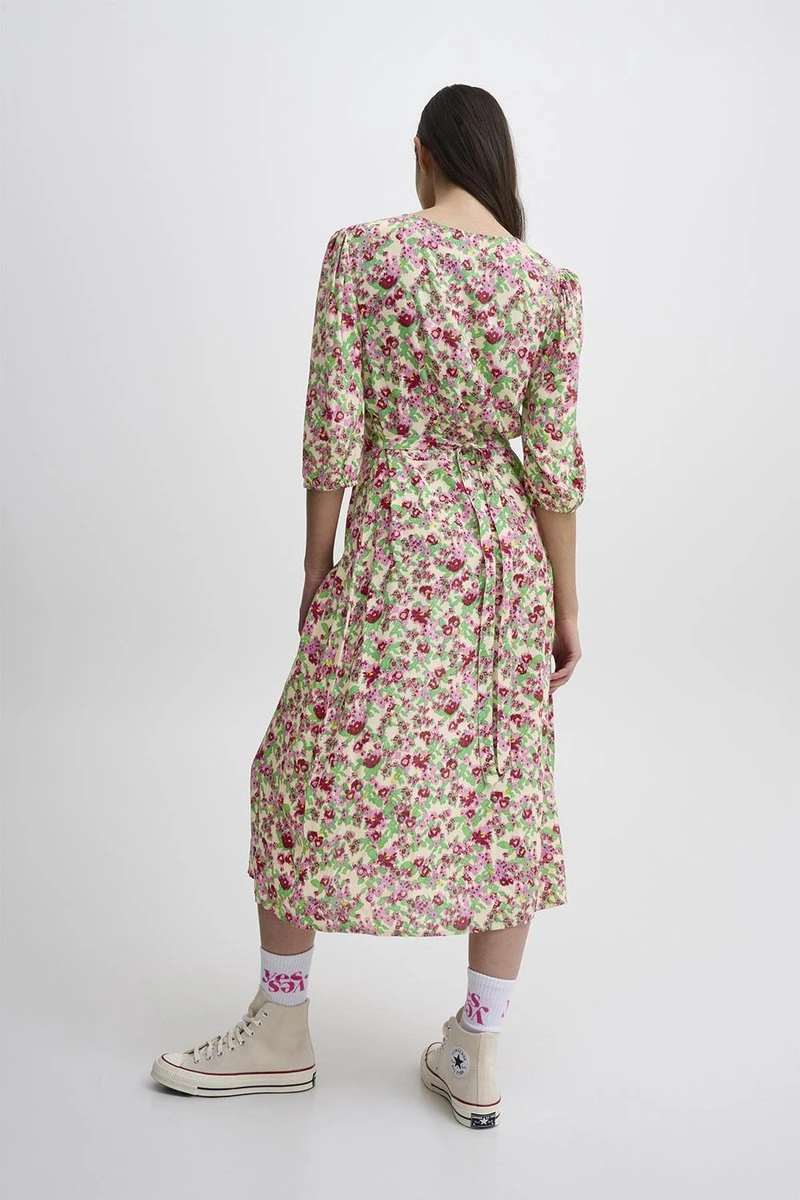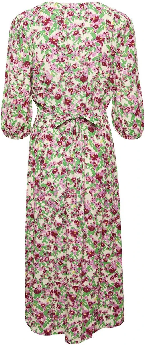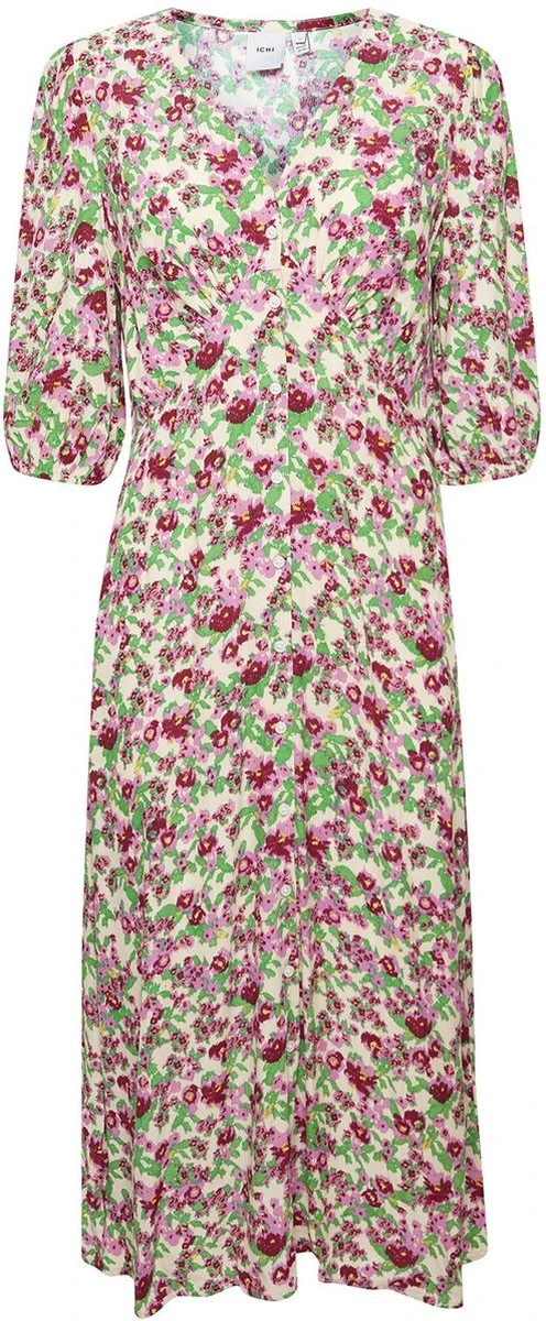 Vrolijke jurk van Ichi met een allover gebloemd patroon. De korte mouwen hebben een elastische zoom. Dit model heeft een V-hals met een rij knopen hieronder. Rond de taille zijn geplooide details geplaatst en een ceintuur om deze te accentueren. De totale lengte is 121 cm bij maat 36. Machinewas 40°c, Niet bleken, Niet in de droger, Stomerij, Warm strijken max 150°c