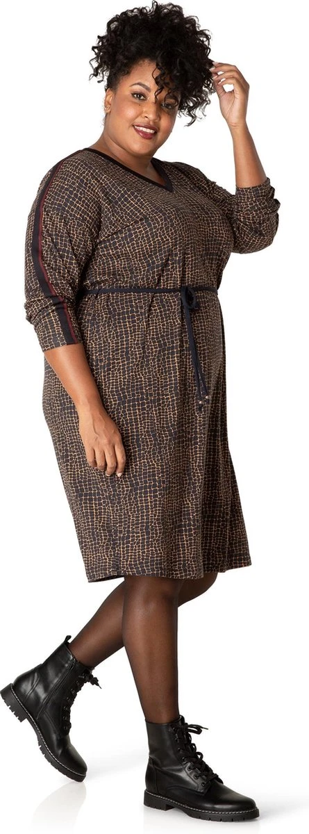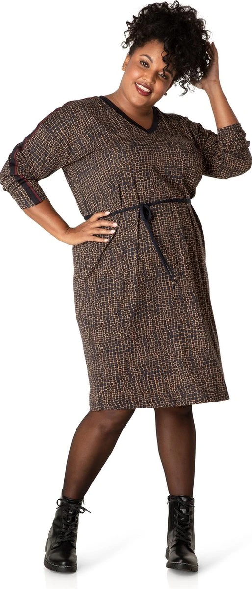Deze V-hals jurk heeft een overall print. De jurk valt wat wijder waardoor je met de ceintuur de jurk mooi kan laten bloezen.