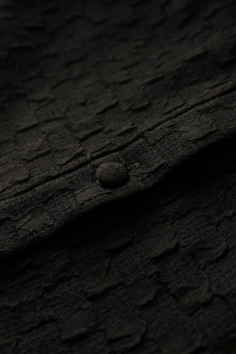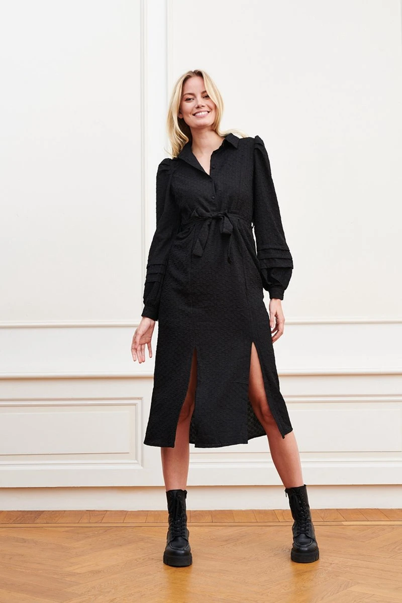 Gestructureerde jurk van Lofty Manner met een polyester voering. De lange mouwen hebben een dun manchet met een knoopje. Dit model heeft een puntkraag met een rij beklede knopen hieronder. In de zij is een blinde ritssluiting geplaatst. De jurk heeft een totale lengte van 120 cm en heeft twee splitten van 35 cm aan de voorkant bij maat S. Handwas, Lauw strijken max 110°c, Machinewas 30°c, Niet bleken, Niet wringen
