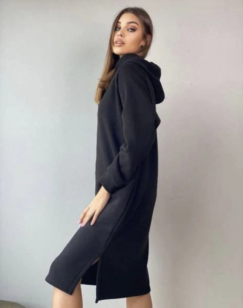 Helemaal hot dit seizoen, de sweater jurk met capuchon.