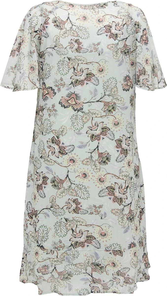 Luchtig jurkje met hempje eronder die los te maken is. De jurk heeft een licht aanwezige streep met glitter in de stof verwerkt. Deze jurk heeft een v-hals en vleermuismouwen. De jurk valt net boven de knie.