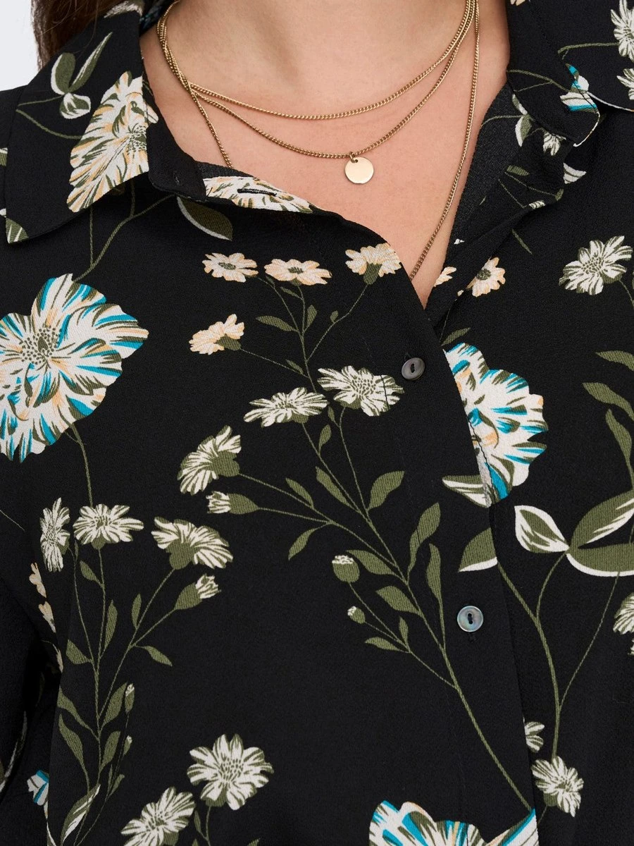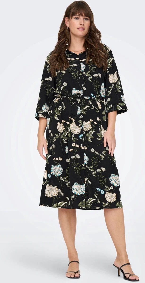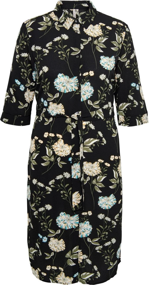 Blousejurk die ruim over de knie valt en een ceintuur om de taille heeft. Driekwart mouwen die speels afgewerkt zijn. De heldere, kleurrijke bloemen geven de jurk kleur.