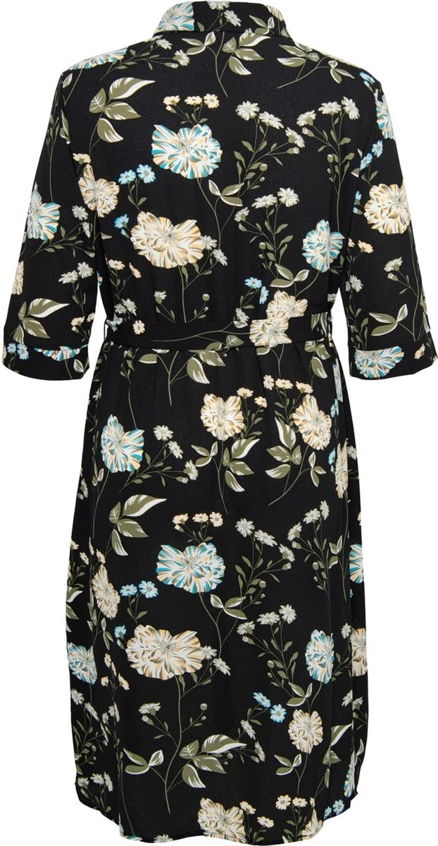 Blousejurk die ruim over de knie valt en een ceintuur om de taille heeft. Driekwart mouwen die speels afgewerkt zijn. De heldere, kleurrijke bloemen geven de jurk kleur.