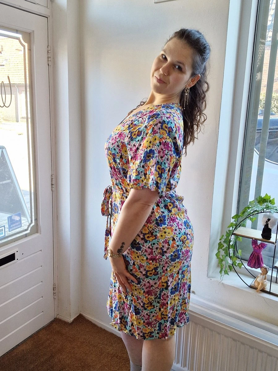 Gebloemde jurk met een uitgebreid kleurpalet aan zomerse kleuren. Bloemen in de kleuren geel, blauw en roze waarin geel de hoofdtoon voert. De jurk heeft een v-hals en sluit door middel van knopen. De mouwen lopen wat uit aan het einde en om de middel zit een ceintuur. De jurk valt net over de knie. Heerlijk in de zomer omdat deze gemaakt is van viscose.