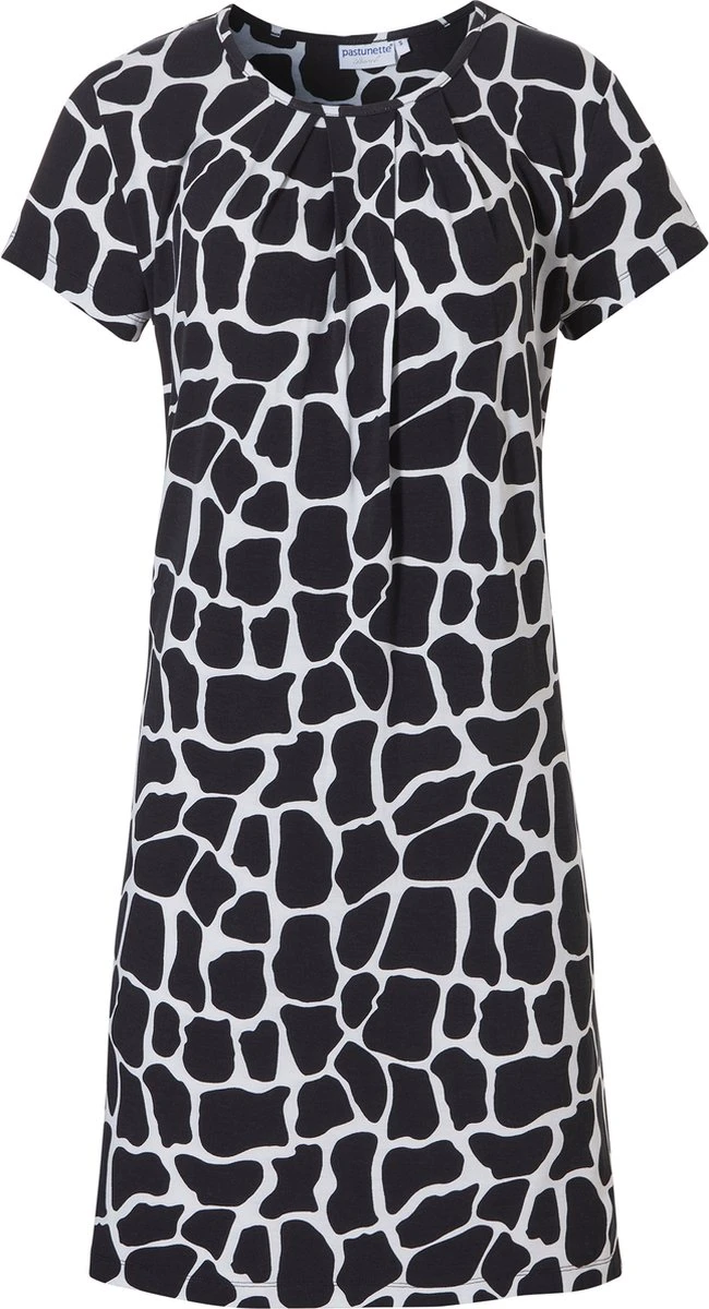 De jurk heeft een ronde hals in de kleuren zwart met wit. De jurk loopt vanuit het boven iets gerimpeld.