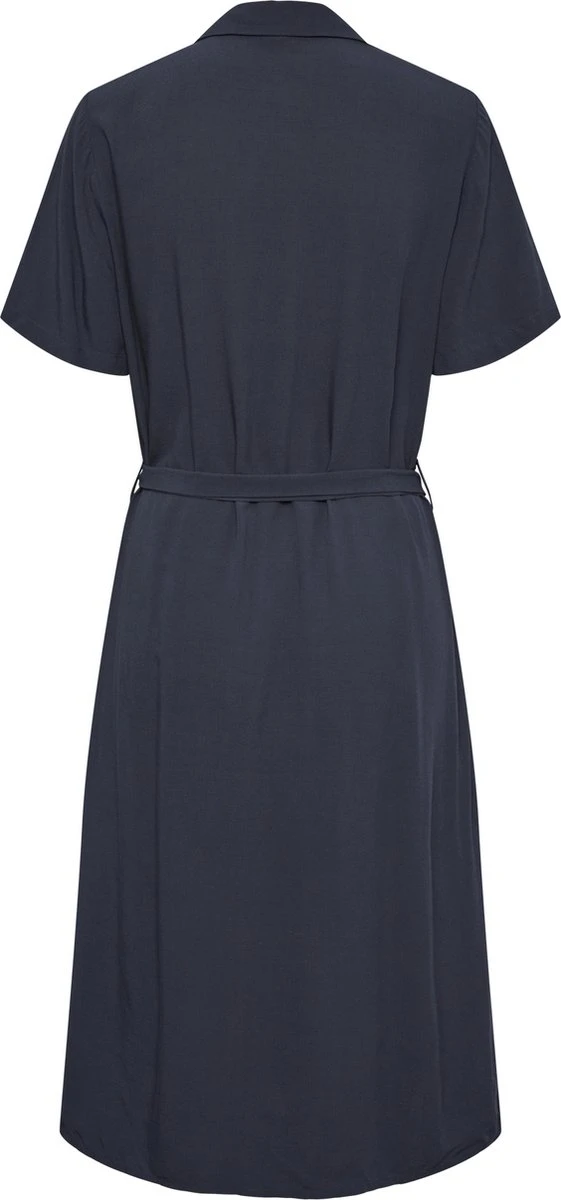 Deze donkerblauwe jurk is een mooie basis voor in je garderobe. De jurk heeft knoopjes aan de voorkant en een riem in de taille. De jurk is gemaakt van 100% viscose waardoor deze heerlijk draagt.