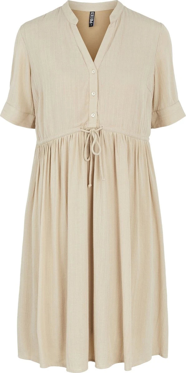 Deze beige jurk heeft korte mouwen en knopen tot aan de taille. In de taille zit een koortje waarmee je de jurk strak kan trekken. De jurk is gemaakt van 100% viscose.