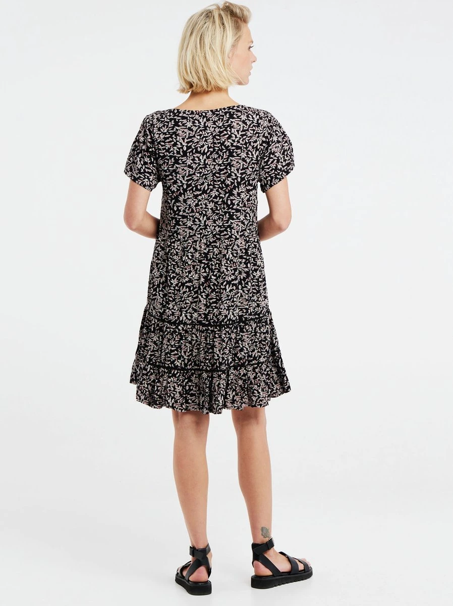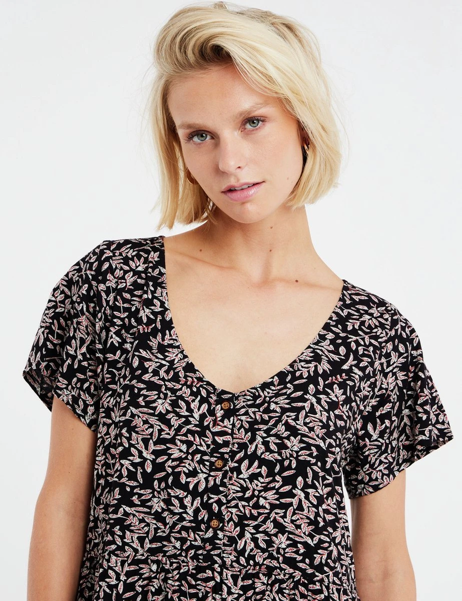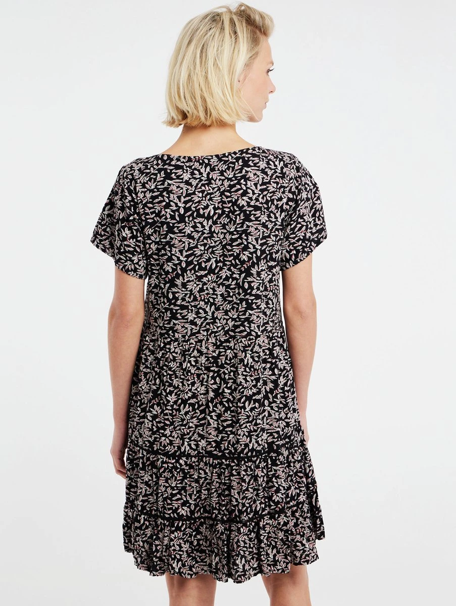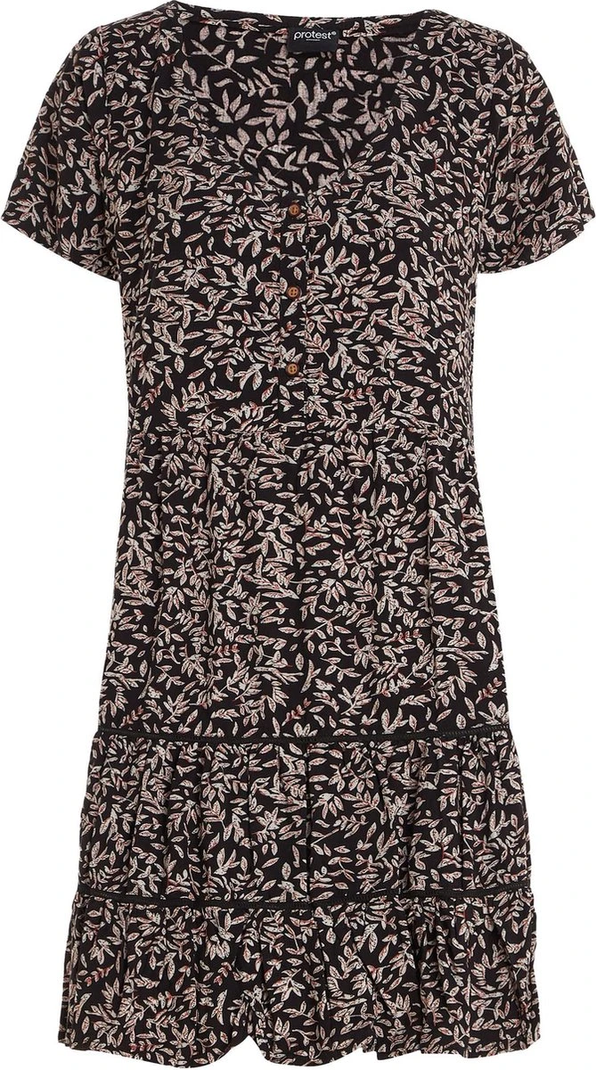 Maak kennis met de PRTLENI van Protest. Deze zomerjurk is gemaakt van 100% viscose, een comfortabele, ademende en lichte stof. De regular fit PRTLENI heeft een flatterende diepe V-hals. De stof heeft een zwart-wit bladpatroon met gele details. De placket aan de voorkant is voorzien van knopen van kokosnoot. De PRTLENI bestaat uit meerdere lagen, wat een grote trend is deze zomer. Deze jurk is ideaal om over je favoriete bikini aan te trekken als je naar het strand gaat. Je bent klaar voor de zomer met de PRTLENI van Protest.