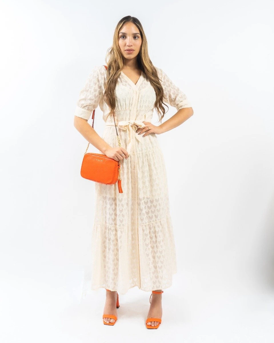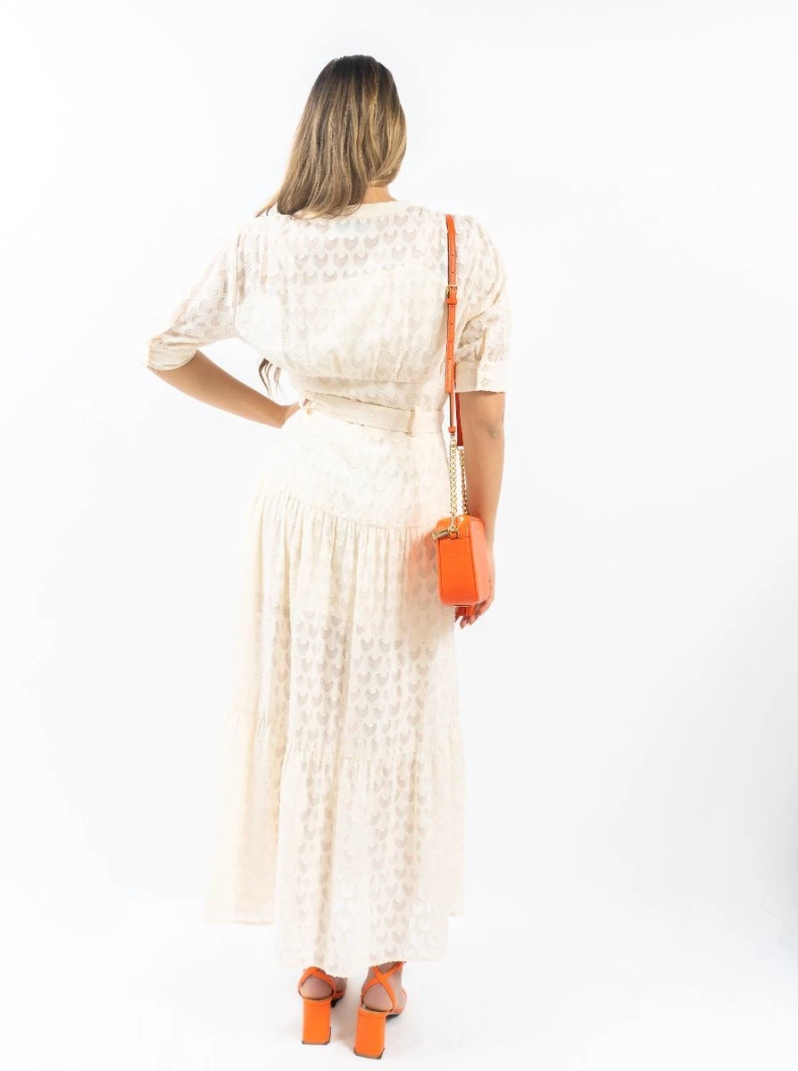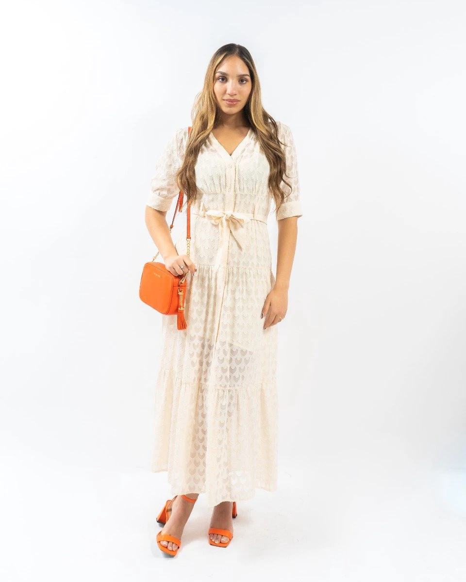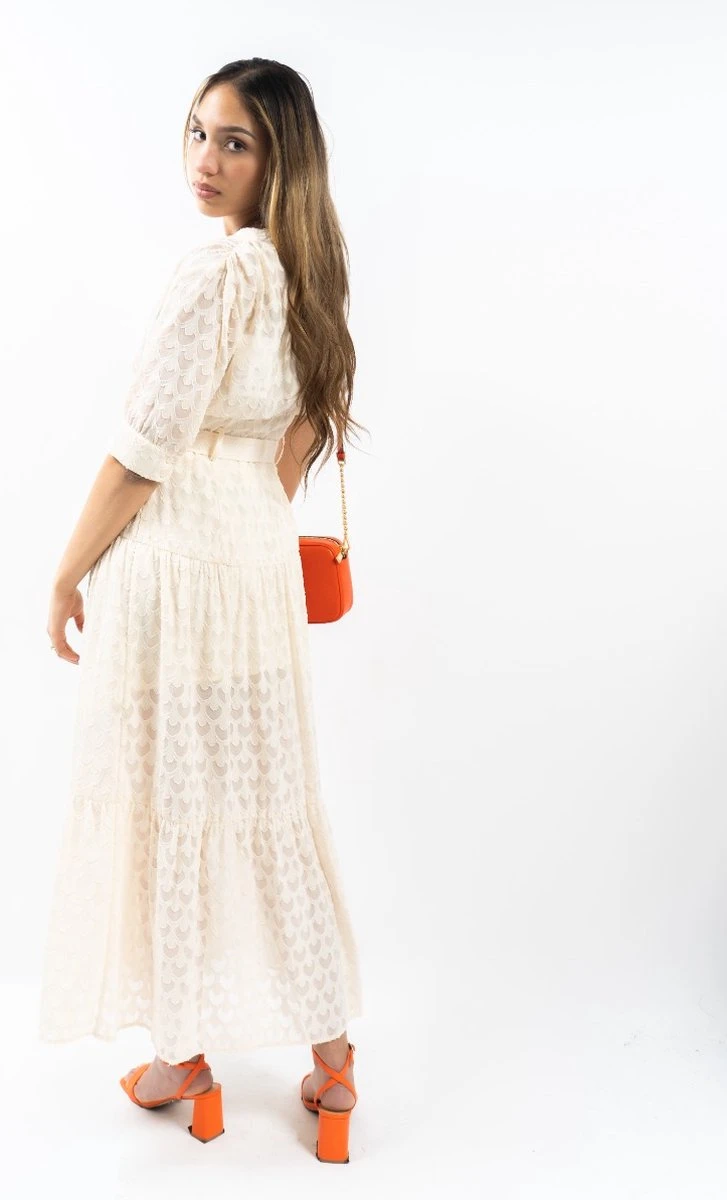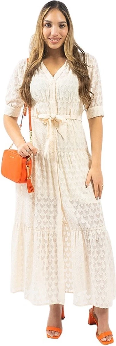 Polik Lange Jurk Polik Lange Jurk uit de nieuwste collectie van Silvian Heach. Deze jurk is beige van kleur en heeft een lange pasvorm. De maxi dress is voorzien van een korte mouwen, een v-halslijn met knoopsluiting aan de voorzijde, een tailleriem en een leuk patroon over de gehele jurk. De jurk is gemaakt van 100% polyester en is perfect te combineren met leuke hakken of sandalen. Het model is 178 cm lang en draagt maat M.