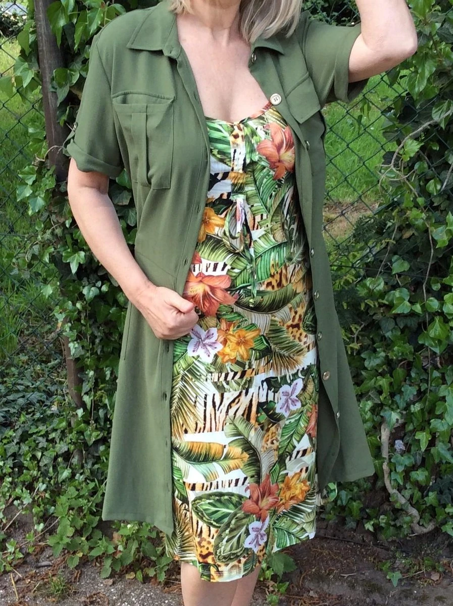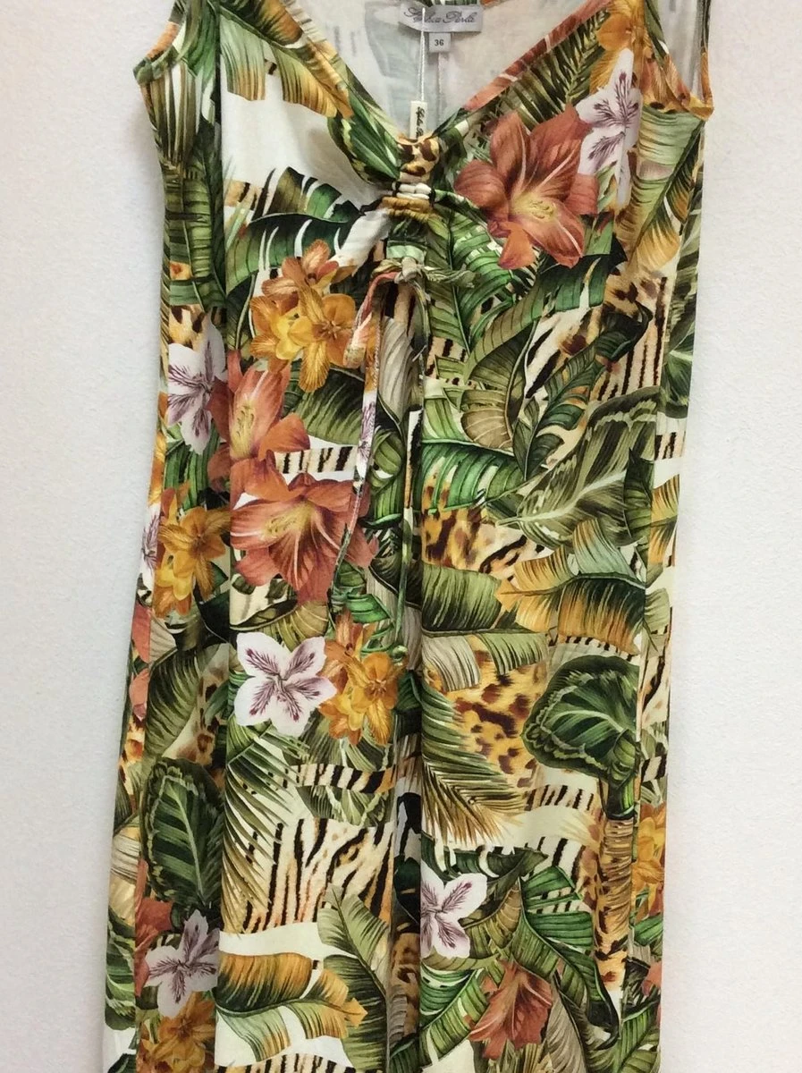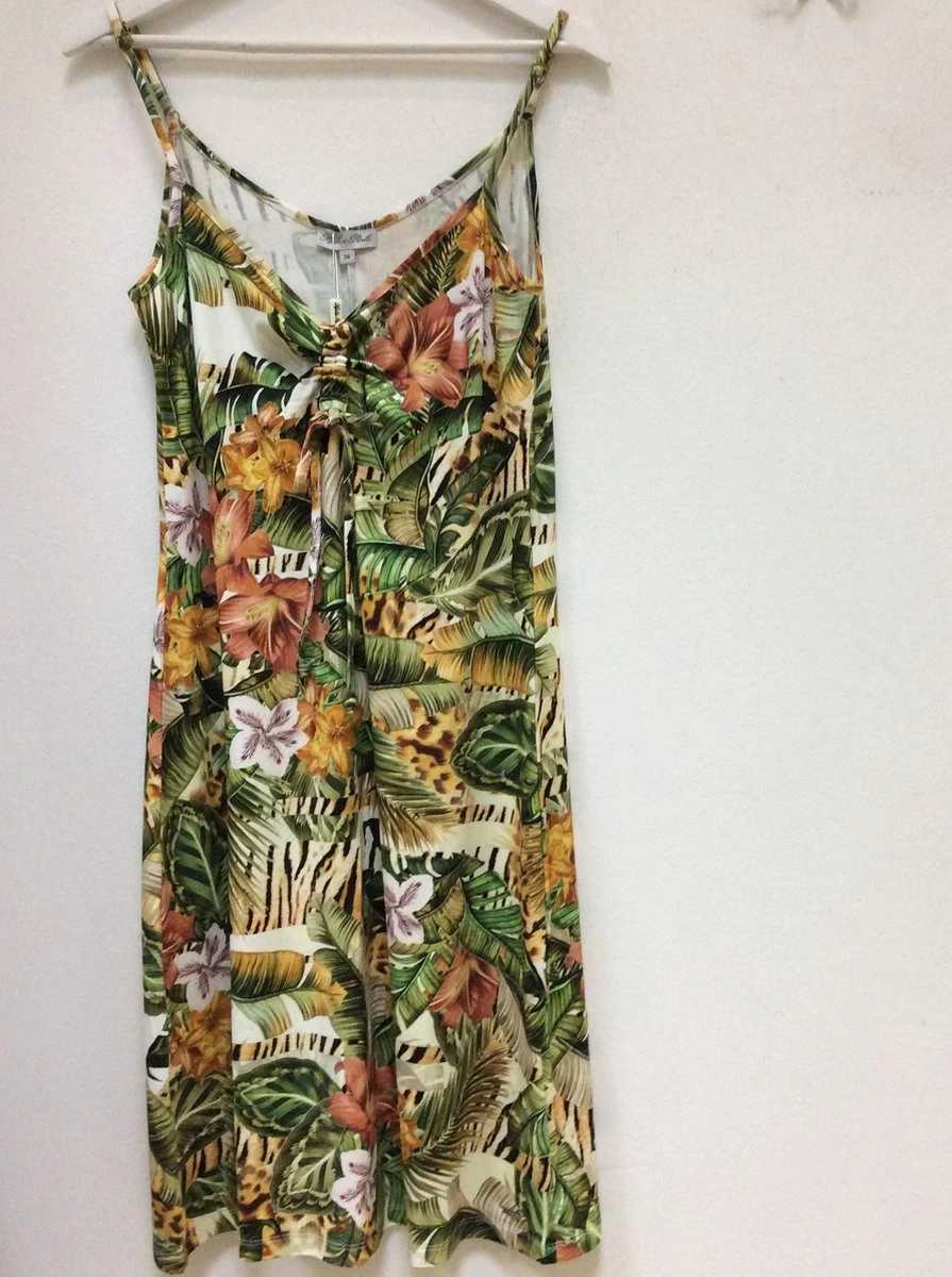 Jurk van het merk Sophia Perla in een leuke Safari print. Stof van deze jurk is viscose, wat dus heerlijk te dragen is o.a. bij warm weer of op het strand. De Safari print heeft een mengeling van verschillende kleuren nl: groen, camel, beige, bruin en bordeaux rood.