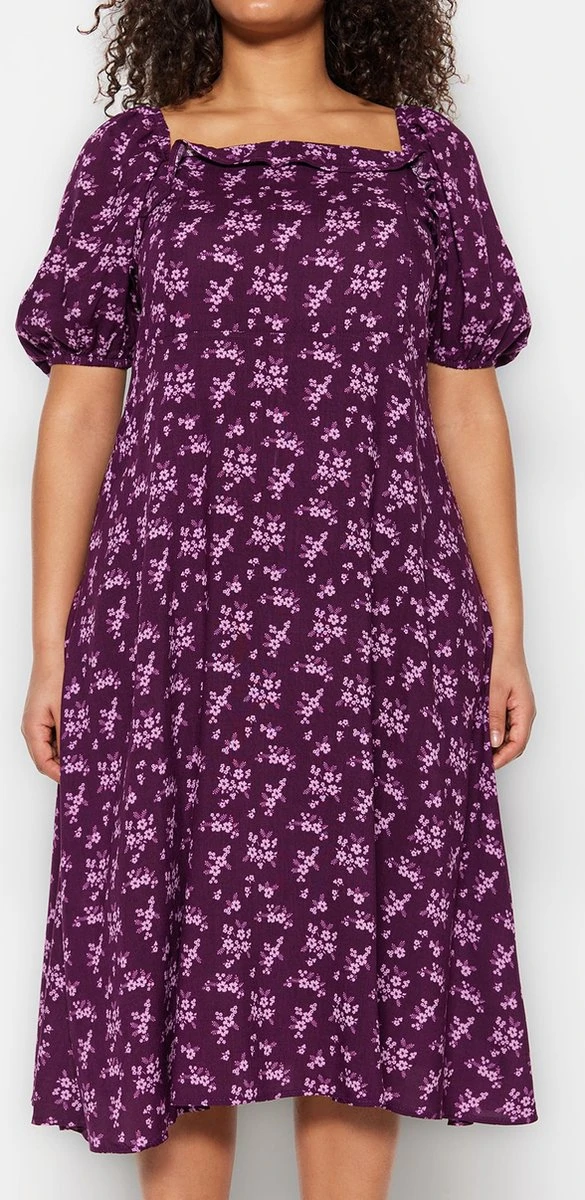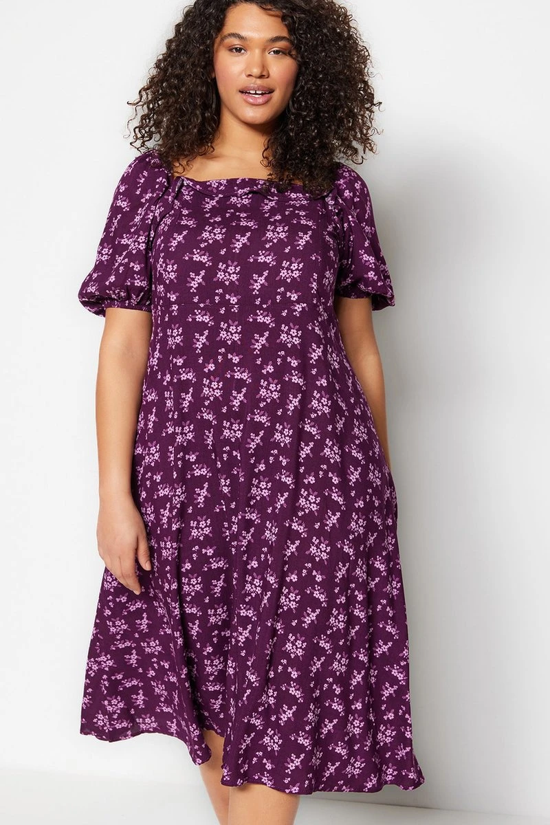 Trendyol Vrouwen Gepofte/ruche Mouw Vierkante Kraag A-lijn Grote Maten Jurk