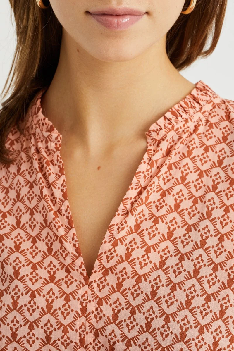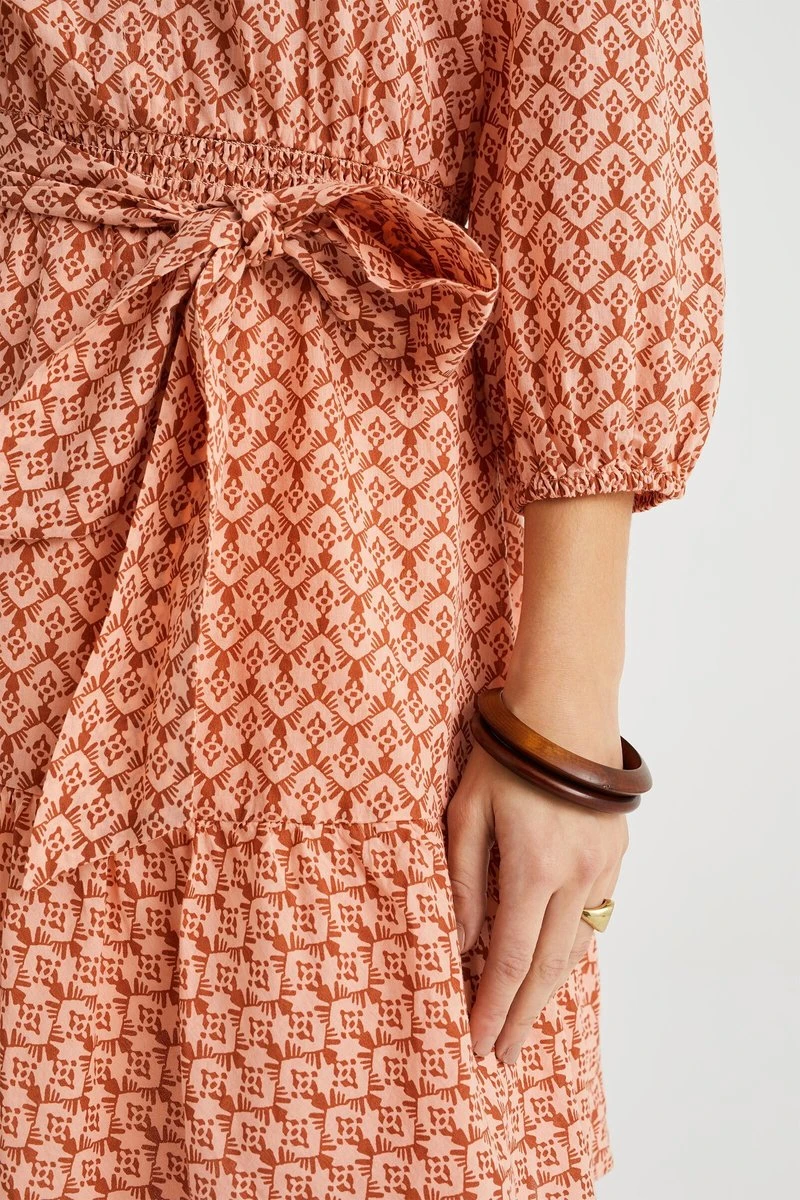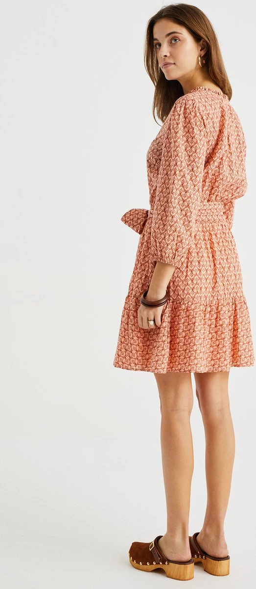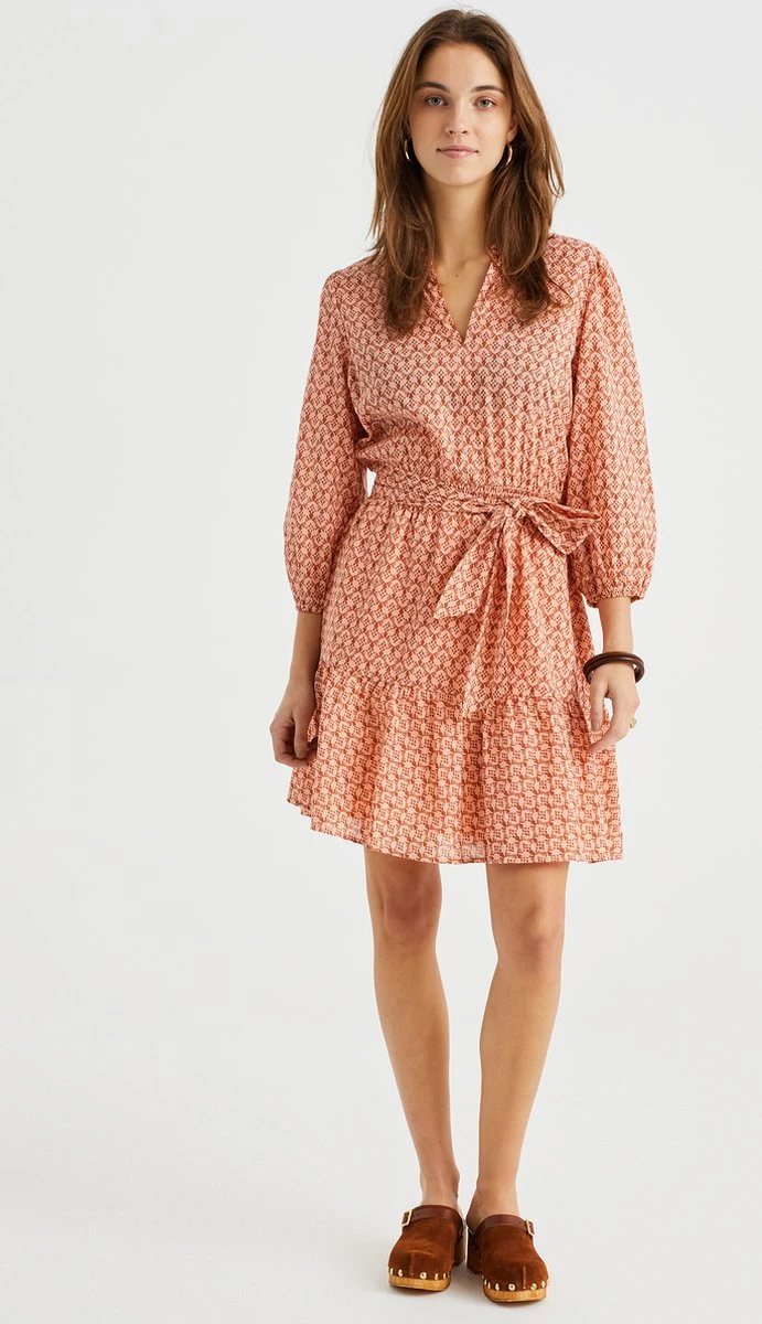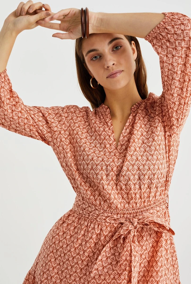 Een regular fit jurk van katoen met een dessin, ruches en strikceintuur. Het model heeft een V-hals, lange mouwen en elastische taille.