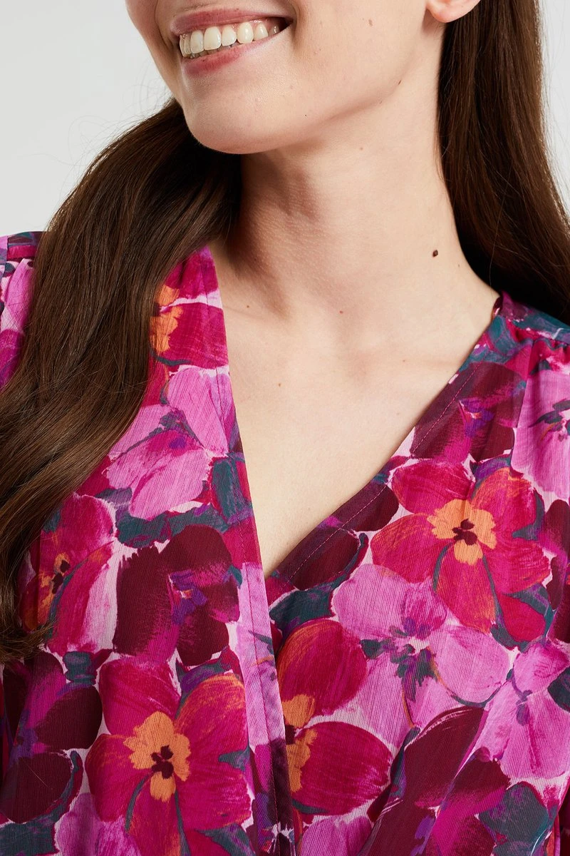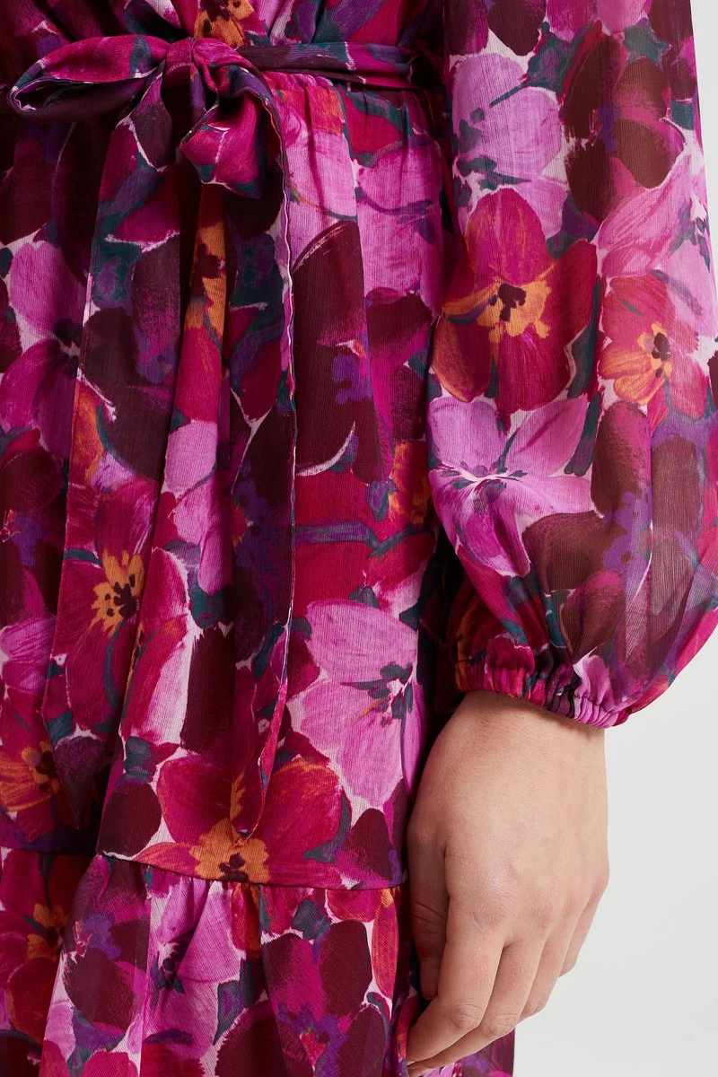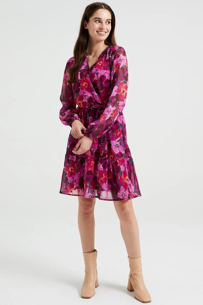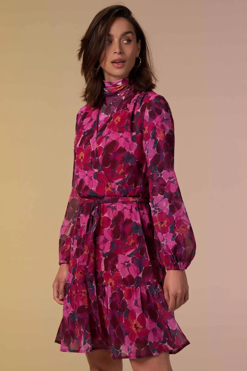 Een regular fit jurk van een geweven kwaliteit met een dessin en elastische taille met strikceintuur. Het model heeft een overslag hals en lange mouwen. De jurk valt op de knie en heeft een onderjurk.