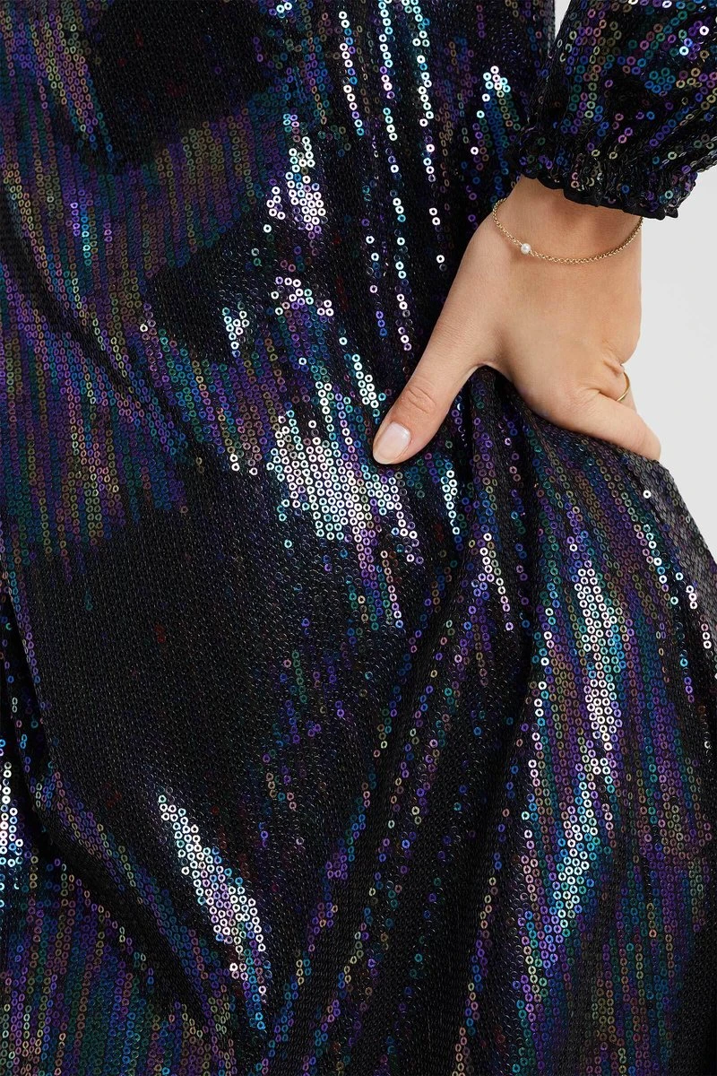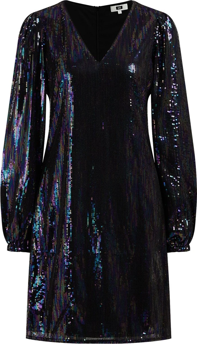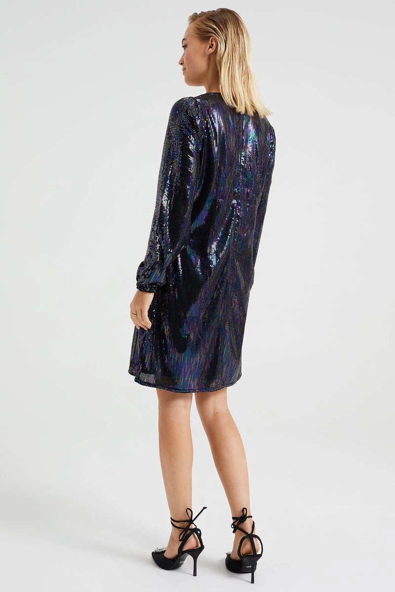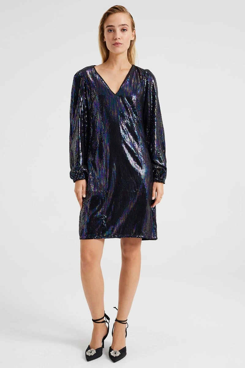 Een regular fit jurk van geweven kwaliteit met pailletten en een ritssluiting. Het model heeft een V-hals en lange mouwen. De jurk valt op de knie.