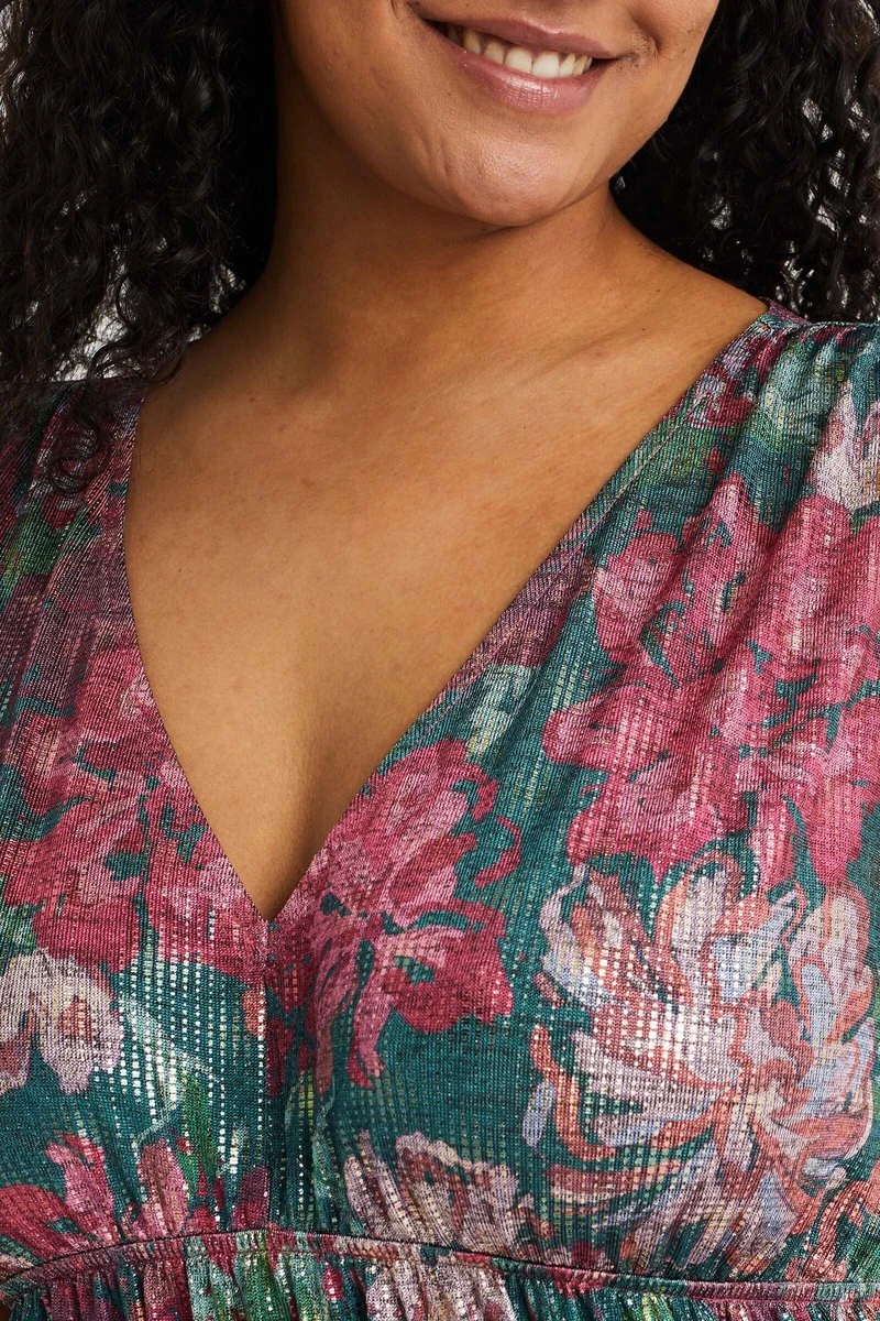 Een regular fit jurk van geweven kwaliteit met een dessin en glitterdetail. Het model heeft een V-hals, knoopsluiting en een open rug. De jurk valt op de enkels.