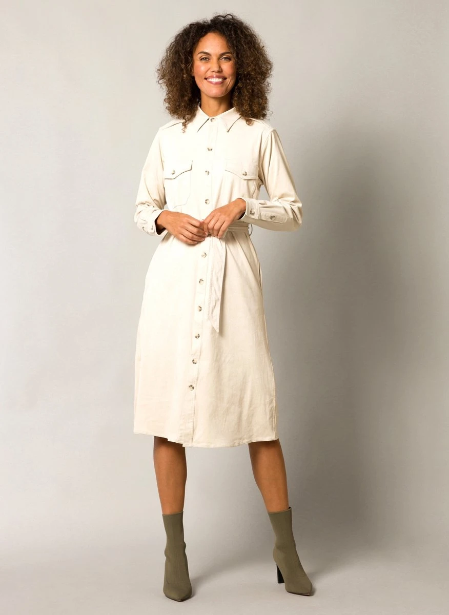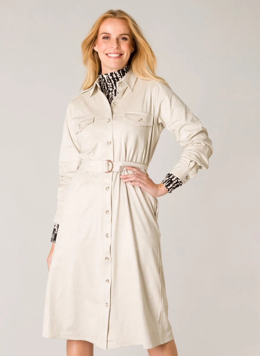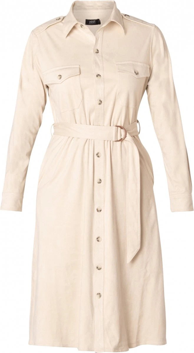 Doorknoopjurk in een aangename zachte faux suède stof. Deze jurk valt tot de knie, heeft een kraag en een knopenrij en lekkere zakken in de zijnaad. Op de schouder epauletten voor een stoere touch. Voorzien van bijpassende ceintuur met koperkleurige metalen gesp. De Angelique van YEST heeft een Regular A-Line Fit en is gemaakt van 85% Polyester en 15% Elastaan. Deze Jurk is verkrijgbaar in Bordeaux en Soft Sand