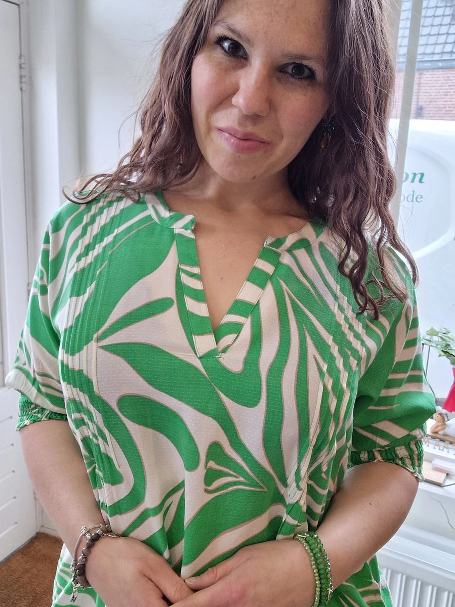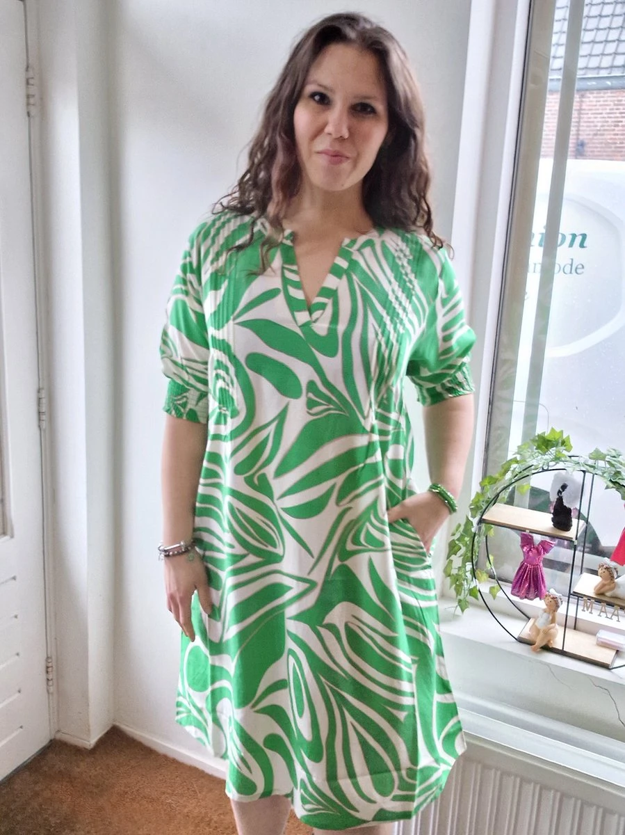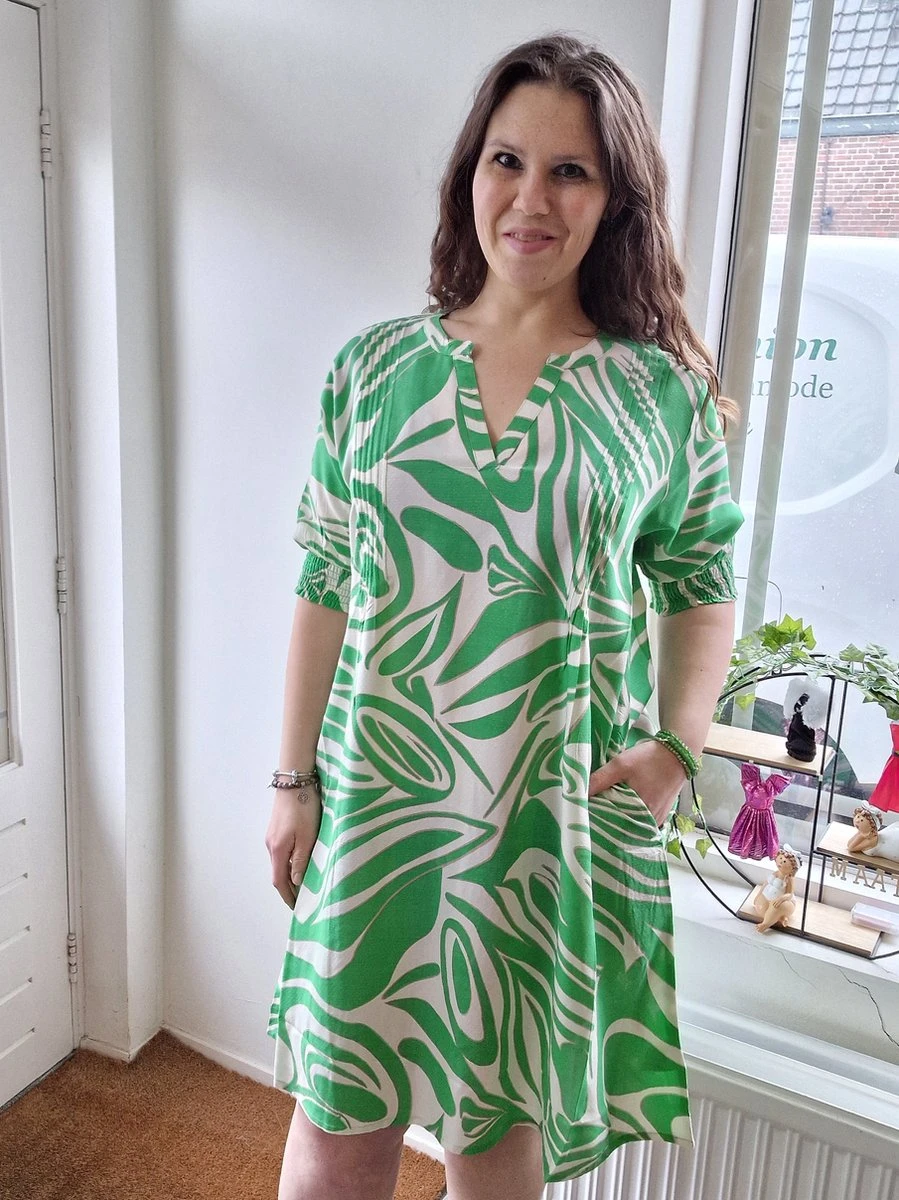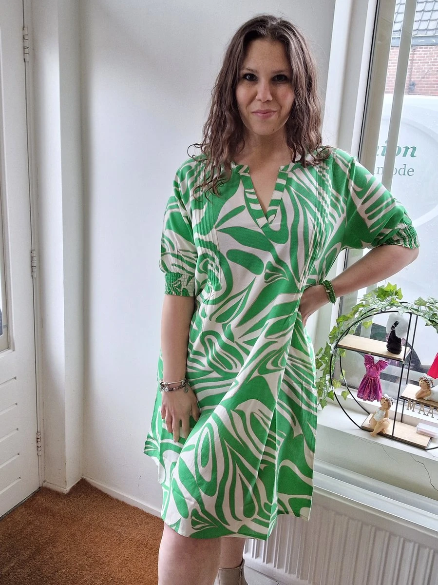 Een echte a-lijn jurk die lekker zwierig valt. Dit is natuurlijk heerlijk in de zomer en zeker omdat de jurk ook nog eens gemaakt is van 100% viscose. De jurk heeft halflange mouwen met een elastische band. De hals is een opvallende v-hals. De kleuren zijn helder en fris. De jurk valt op de knie en heeft ook nog zakken.