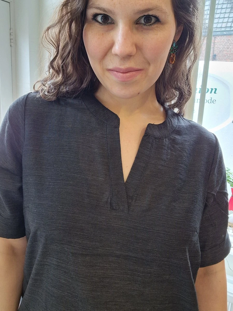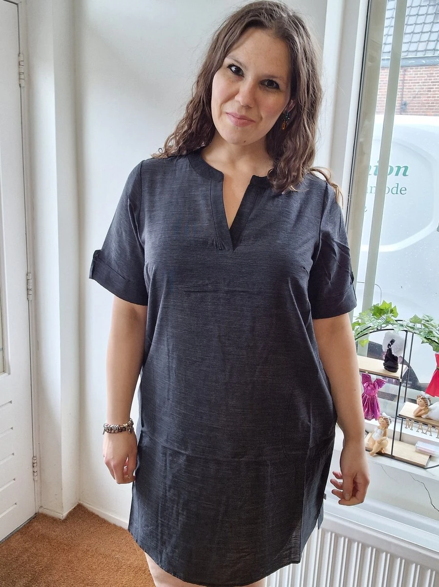 Zoals je van Zhenzi gewend bent een jurk van erg fijne stof die heerlijk draagt. De jurk loopt onder rond en heeft aan de zijkanten een kleine split. Korte mouwen waarvan aan de uiteinden de stof is omgeslagen met een knoopje. De hals is een echte v-hals die mooi is afgewerkt. Heerlijk luchtig in de zomer! De stof schijnt iets door.