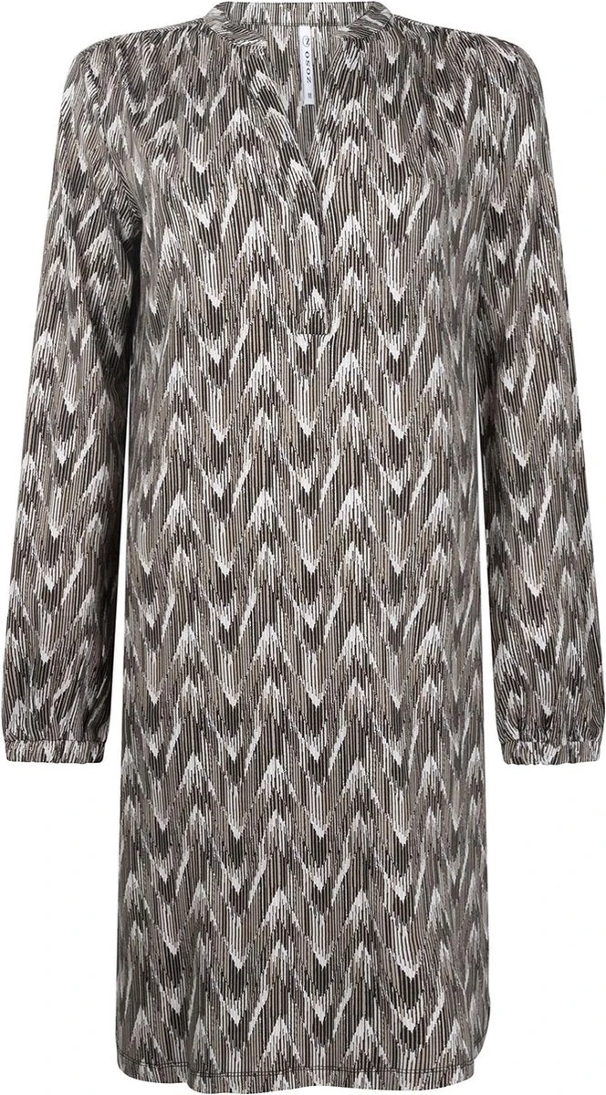 Halflange jurk van Zoso met lange mouwen. Dit rechte model is voorzien van een zigzag patroon. Totale lengte is 95 cm bij maat S. Lauw strijken max 110°c, Machinewas 30°c fijne was, Niet bleken, Niet in de droger, Niet stomen