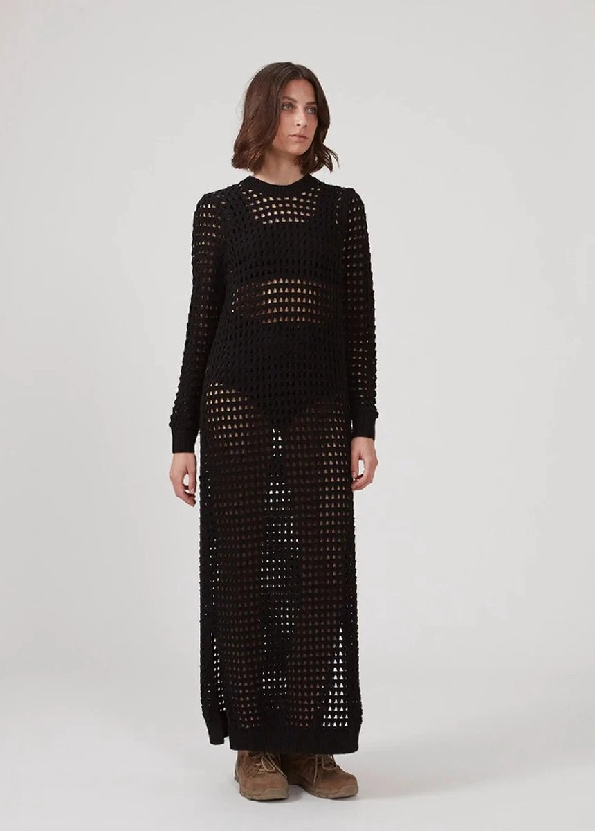 Helemaal on trend deze zwarte lange crochet maxi-jurk van het merk Modstrom. De zwarte maxi-jurk is gemaakt van biologisch katoen. CamdenMD jurk heeft een relaxte pasvorm, lange mouwen en een ronde halslijn met geribbelde biezen.